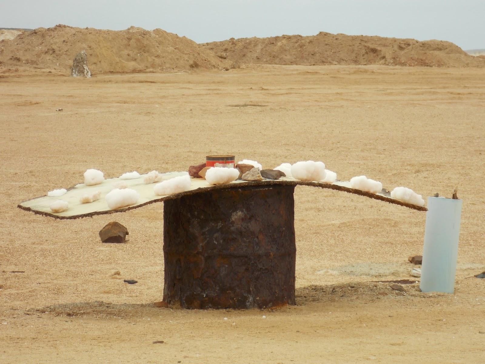 tables with lumps of white rock which turn out to be salt crystals. Apparently you